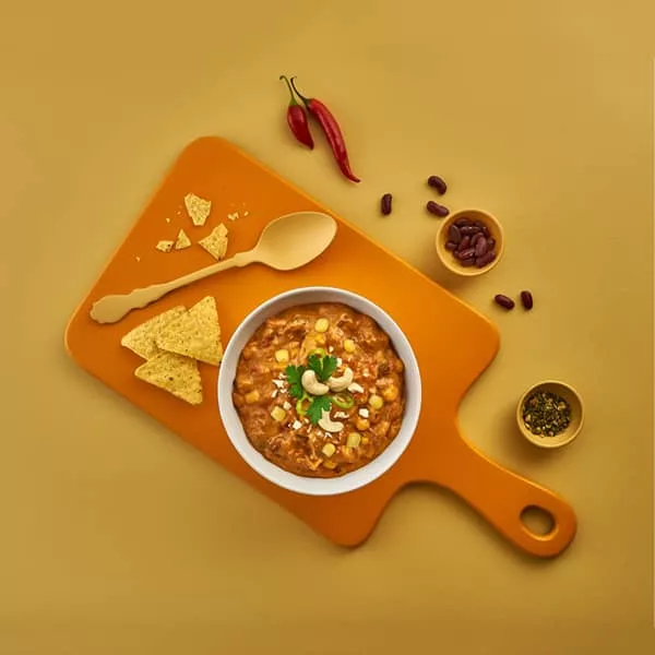 Składniki: warzywa w zmiennych proporcjach 39% (paprytamina, fasola czerwona 33%, kukurydza 28%), woda pitna, pomidory bez skórki (pomidory bez skórki, sok pomidorowy), płatki drożdżowe piwne, olej kokosowy, mąka z brązowego ryżu, marchew,